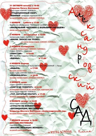 Фестивальная афиша традиционно максимально насыщена. За семь дней по 7 ноября свои спектакли в рамках форума покажут десять театральных коллективов из Ульяновска, Пензы, Заречного. Как всегда, свои новые и уже полюбившиеся публике работы представят ученики и коллеги Бориса Владимировича Александрова. Кроме того, «Александровский сад» снискал славу экспериментальной творческой площадки для тех, кто безгранично любит театр, предан ему. Организаторы, как и прежде, не стремятся поразить воображение пафосной конкурсной программой, хотя она традиционно сильна и на любой вкус. Не гонятся за дорогими призами. Гости и участники получают милые трогательные подарки ручной работы. Главным приоритетом фестиваля остаются общение, стремление к теплоте, свету, радостям встреч. А уже в ближайшую пятницу - программа открытия «Традиционный сбор». Будут яркие театральные капустники, выступления коллег Бориса Александрова из Ульяновского драматического театра им. И.А. Гончарова. Один из учеников Бориса Владимировича, преподаватель кафедры актерского мастерства факультета культуры и искусства Ульяновского государственного университета, кандидат педагогических наук Алексей Храбсков представит спектакль «Юбилей» по Чехову, который сыграют его студенты. Кроме того, свою дебютную авторско-режиссерскую миниатюру «Абсолютное желание» в рамках «Традиционного сбора» покажет актер Enfant terrible Сергей Карачев.