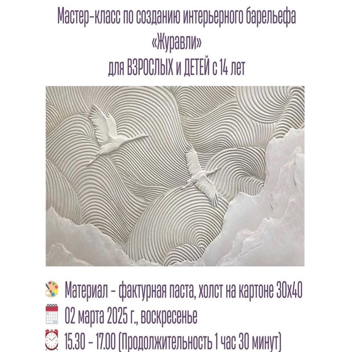 Любителей творчества ждут в студии «Мастерская искусства» на создания декоративного барельефа «Журавли» с использованием фактурной пасты. Все материалы и инструменты предоставляются мастерской для каждого ученика в полном объёме. 14+. А еще в расписании студии можно найти мастер-классы по кулинарии, вязанию, скульптуре, рисованию и другим техникам декоративно-прикладного творчества для детей и взрослых.