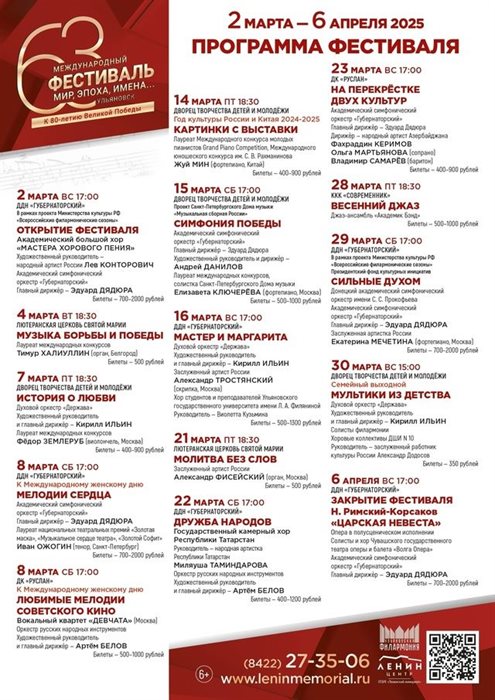 2 марта в Ульяновске откроется 63-й Международный музыкальный фестиваль «МИР, ЭПОХА, ИМЕНА…». Это главное ежегодное музыкальное событие региона. В концертах примут участие коллективы и артисты из Азербайджана, Китая и регионов России, а также ведущие творческие коллективы Ульяновской филармонии – Ульяновский симфонический оркестр «Губернаторский», Ульяновский оркестр русских народных инструментов, Ульяновский духовой оркестр «Держава» и джаз-ансамбль «Академик Бэнд». Подробности – в афише. 6+.