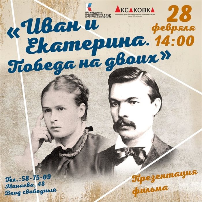 Пятница тоже обещает быть насыщенной. В 14:00 в Ульяновской областной библиотеке имени Аксакова состоится премьерный показ фильма «Иван и Екатерина. Победа на двоих». Фильм, основанный на исторически выверенном материале, письмах и архивных документах, расскажет о просветителе чувашского народа Иване Яковлеве и его супруге Екатерине Бобровниковой. Впервые будет рассказана история жизни великого человека через историю его семьи, которая началась с брака по расчету. И впервые фильм расскажет о династии Бобровниковых - предках Екатерины Яковлевой. Фильм представят издатель, журналист, писатель Наталья Цуканова и писатель, главный редактор журнала «Мономах» Ольга Шейпак. Вход свободный. 12+. Если нет возможности увидеть фильм сегодня, то приходите 2 марта к 13:00 на заседание клуба «На волне вдохновения» в библиотеке №4. Здесь фильм представит Ольга Шейпак, состоится ее творческий вечер. Вход свободный, 12+.