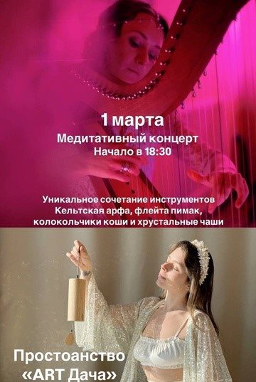 В пространстве Арт дача в 18:30 начнется утончённый концерт, где звучание кельтской арфы, флейты пимак и звуки колокольчиков создадут уникальную музыкальную палитру. Количество мест ограничено, на мероприятие лучше записаться заранее. 18+.