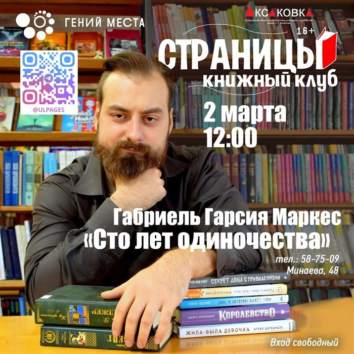 В Аксаковке встретятся книголюбы . Постоянные участники и гости книжного клуба «Страницы» обсудят роман «Сто лет одиночества» Габриеля Гарсии Маркеса, повествующий о трагической истории семьи Буэндиа. 16+.