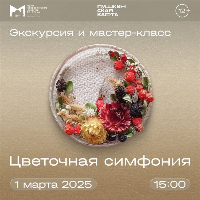 В Музей изобразительного искусства XX-XXI вв. состоится экскурсия и мастер-класс «Цветочная симфония» по изготовлению декоративного панно из сухоцветов. А в ходе экскурсии участники познакомятся с натюрмортами художников XX века, представленных в постоянной экспозиции музея: Мартироса Сарьяна, Алексея Кравченко, Натальи Гончаровой, Ильи Машкова, Елены Бебутовой-Кузнецовой. 12+.