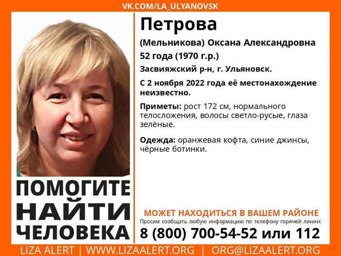 Вчера, 2 ноября, в Засвияжском районе Ульяновска пропала Петрова (Мельникова) Оксана Александровна. Ей 52 года (1970 года рождения).