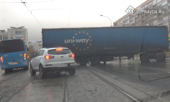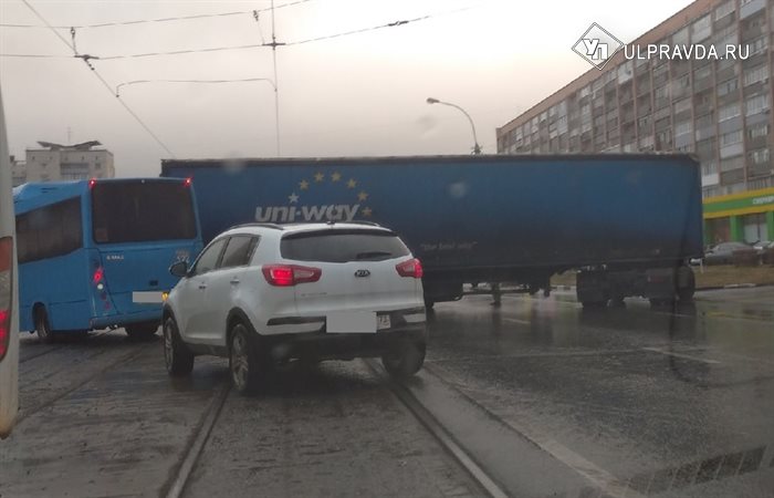 На улице Минаева столкнулись грузовой автомобиль и легковушка, сообщает наш собственный источник. При этом фура заняла все полосы. Движущиеся в попутном направлении машины вынуждены объезжать грузовик по трамвайным путям.