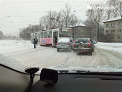 В районе пересечения с Западным бульваром в трамвай врезалась «Лада-Гранта Лифтбэк». Это существенно затруднило движения на одной из главных транспортных артерий города.