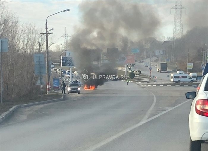 Сейчас на подъезде к мосту через Волгу в Ленинском районе Ульяновска горит автомобиль, предположительно марки «ВАЗ-2114».