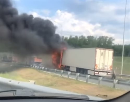 На переправе через Волгу (Президентском мосту) загорелся грузовой автомобиль в составе с полуприцепом. На месте работают специальные службы.
