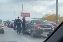 На путепроводе между улицей Рябикова и Западным бульваром столкнулись несколько машин. Движение затруднено.