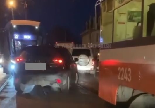 Утром на улице Радищева на трамвайных путях столкнулись автобус и такси. Из-за аварии электротранспорт прекратил движение в обоих направлениях.