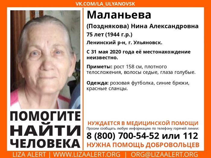 Известны приметы Нины Александровны: рост 158 см, плотного телосложения, волосы седые, глаза голубые. Была одета в розовую футболку, синие брюки и красные сланцы.