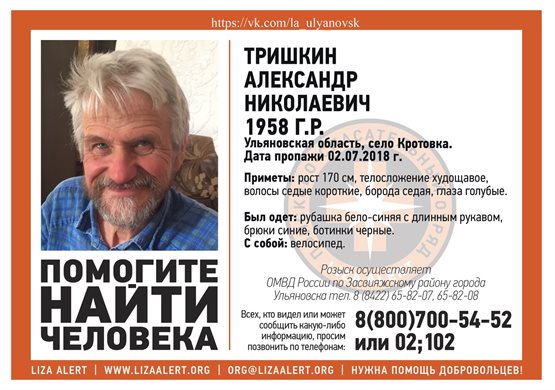 60-летний Александр Тришкин ушел из дома в селе Кротовка Ульяновской области еще 2 июля. С тех пор родные ничего о нем не слышали.