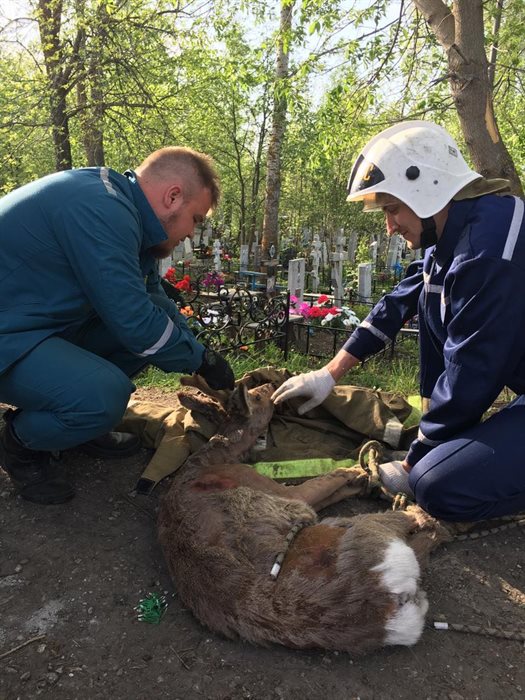 Спасатели помогли косуле выбраться из железного плена на кладбище