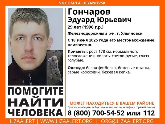 18 июня в Железнодорожном районе Ульяновска пропал 29-летний Гончаров Эдуард Юрьевич.
