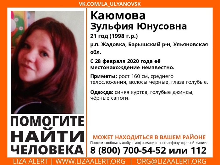 Последний раз голубоглазую черноволосую Зульфию Каюмову видели 28 февраля в поселке Жадовка (Барышский район). Невысокая (рост 160 см) среднего телосложения девушка была одета в синюю куртку, голубые джинсы, на ногах у Зульфии были чёрные сапоги.