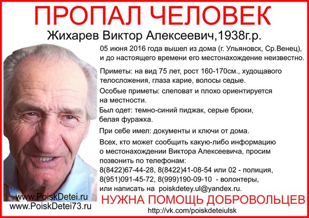 5 июня в 21:30 в районе Среднего Венца в Ульяновске , ушел в сторону травмпункта и не вернулся Жихарев Виктор Алексеевич 1938 года. Был одет в темно-синий пиджак, белую фуражку и серые брюки. Он слеповат и плохо ориентируется.