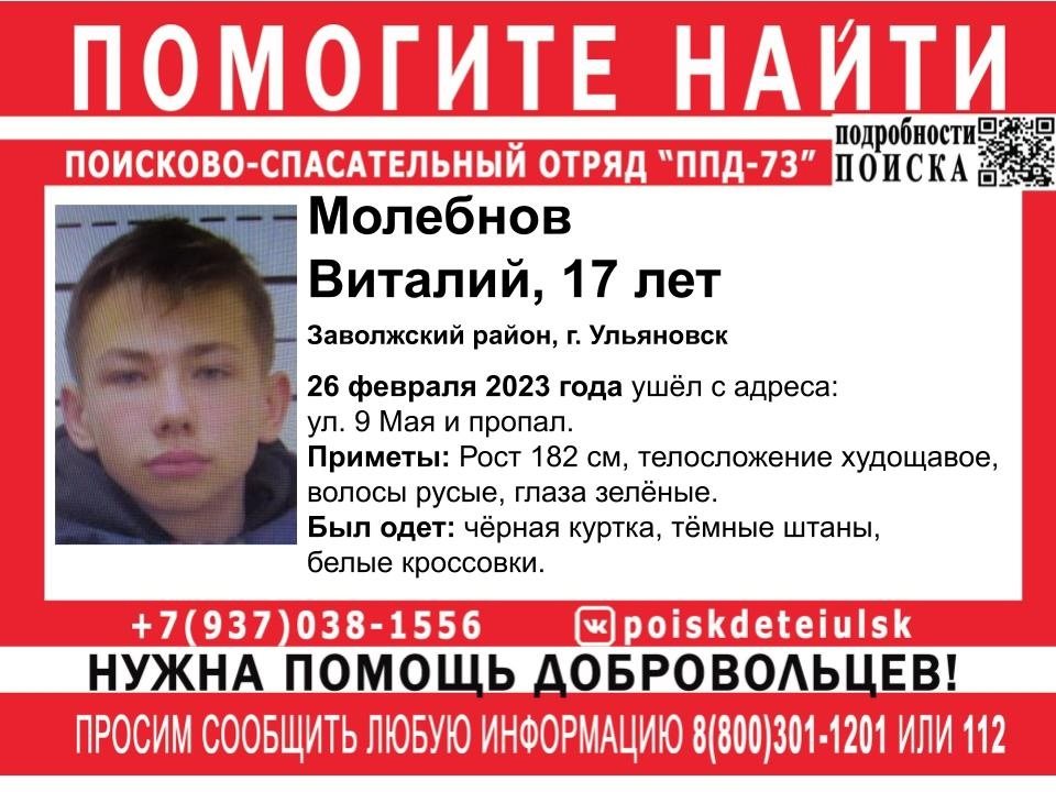 Со вчерашнего дня неизвестно местонахождение Виталия Молебнова. К поискам подключились сотрудники полиции и волонтеры поисково-спасательного отряда «Поиск пропавших детей – 73-й регион».
