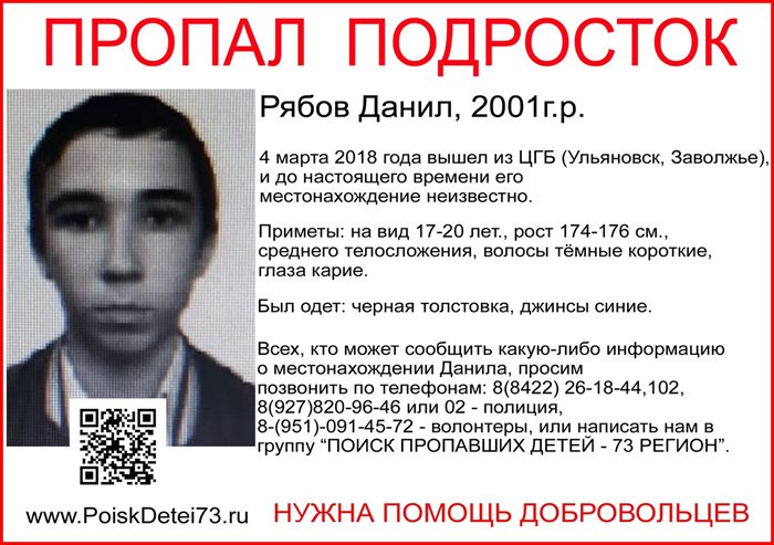 - Вчера вечером сотрудники полиции обратились с просьбой разослать ориентировки по поиску 16-летнего Данилы Рябова, что мы оперативно сделали, - сообщила ulpravda.ru координатор поисков, волонтер Зоя. – Известно, что родные тоже его ищут. Больше никакой информации пока нет.