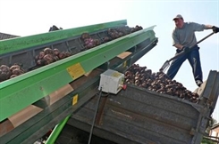 С полей картофель поступает на сортировочную базу. Специальный аппарат практически не отсеивает мелкий картофель - из-за его отсутствия. А это еще один показатель хорошего урожая.
