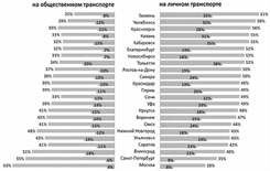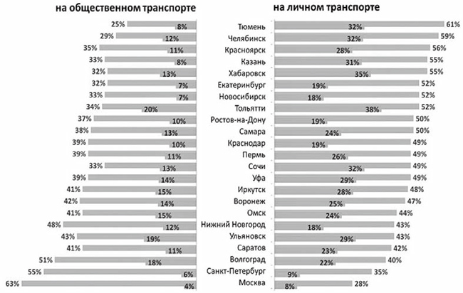 Жители разных российских городов практически единодушны в оценке идеального времени, которое они готовы потратить на маршрут «дом - работа»: эта цифра в среднем составляет 10 - 20 минут. Москвичи и петербуржцы наименее притязательны в этом вопросе: оптимальное время в пути, по их оценкам, составляет около 20 - 25 минут. Самые требовательные - жители Тольятти: идеальная продолжительность поездки на работу для них - 10 - 15 минут, при том, что среднестатистический тольяттинец и так добирается до работы быстрее жителей других крупных городов.