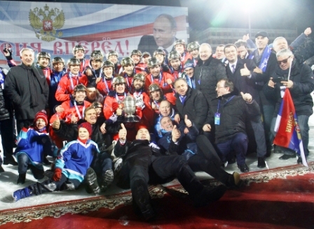 Но мне хотелось бы поздравить всех нас: хоккеистов, тренеров, болельщиков. Ведь все мы вместе и есть Россия!