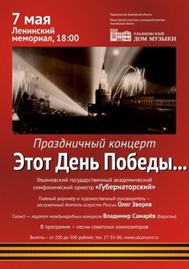 В программе концерта солист Владимир Самарёв совместно с Ульяновским Государственным академическим симфоническим оркестром «Губернаторский» (дирижер – Заслуженный деятель искусств России Олег Зверев) исполнит самые известные песни о войне.