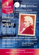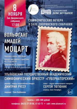 Ульяновский государственный академический симфонический оркестр «Губернаторский» под управлением Дмитрия Руссу - лауреата Всероссийского конкурса, исполнит произведения великого австрийского композитора Вольфганга Амадея Моцарта. Солист вечера – молодой скрипач из Санкт-Петербурга Сергей Тютюник. Он является первым исполнителем сочинений композиторов-современников, в частности, скрипичного концерта Ильи Остромогильского и «Passus Duriusculus» для скрипки соло Геннадия Белова. В настоящее время Сергей Тютюник работает в Академическом симфоническом оркестре Санкт-Петербургской Филармонии.