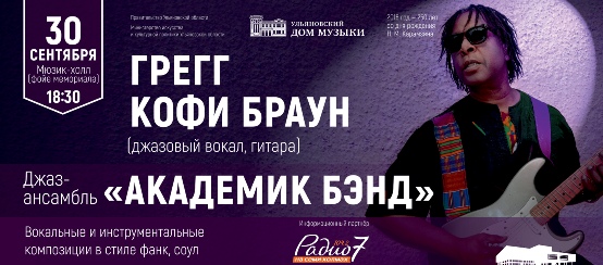 Британский джазовый исполнитель Грегг Кофи Браун выступит 30 сентября в Ульяновске в Мюзик-холле (фойе первого этажа) Ленинского мемориала вместе с ульяновским джазовым ансамблем «Академик Бэнд».