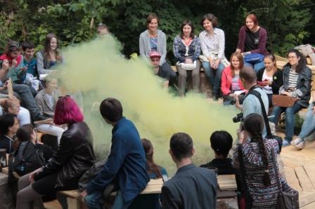 Двое немецких художников из группы KUNSTrePUBLIKсоорудили над разрушенной узбекской беседкой помост, который послужил скамейками для собравшихся. Внутри самой беседки разместили громкоговоритель, который голосом переводчика Google вещал от имени «оракула». «Оракулу» можно было задавать любой вопрос, прислав его по СМС. Вопросы, в свою очередь, были самые разные – от того, что ждет парк, до того, какой будет урожай баклажанов в этом году. «Оракул» же отвечал на них с помощью разноцветного дыма.