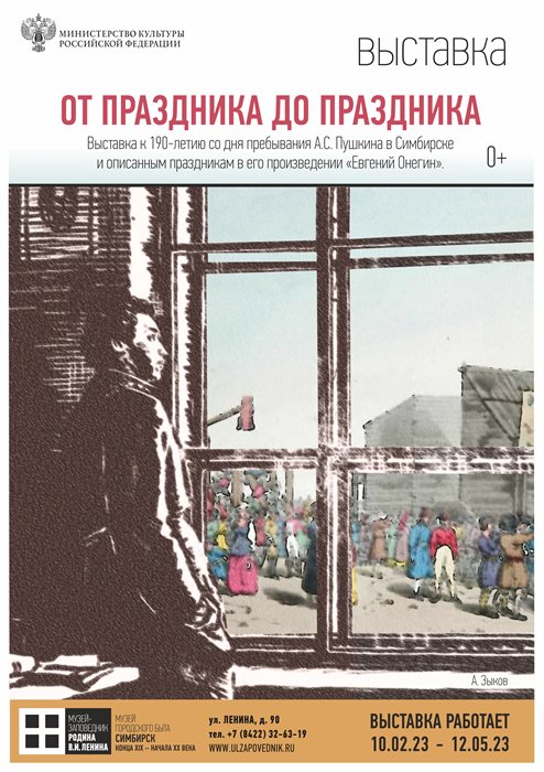 Сегодня в музее-усадьбе городского быта «Симбирск конца XIX – начала XX вв.» (ул. Ленина, 90) открывается выставка «От праздника до праздника» (0+) из цикла «Город и народные традиции» к 190-летию со дня пребывания А. С. Пушкина в Симбирске. Гости увидят более 30 предметов из фондовых коллекций музея-заповедника «Родина В. И. Ленина»: народные игрушки, календари, письма горожан, открытки почтовые и т. п. Кроме того, состоится представление о традициях их использования в обрядах и народных праздниках через отрывки из произведений великого русского поэта.