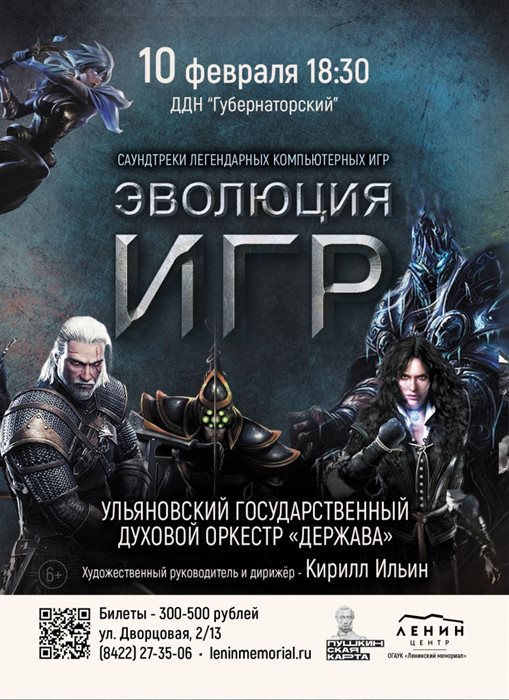 Сегодня в 18.30 во дворце «Губернаторский» Ульяновский государственный духовой оркестр «Держава» (художественный руководитель и главный дирижёр - Кирилл Ильин) представит «Эволюцию игр» (6+). Прозвучат саундтреки из культовых игр, а именно: музыка легендарных компьютерных игр «Танки», «Ведьмак», «Супер Марио», «Тетрис», Fallout, «Лига Легенд», Dota2, Warcraft.