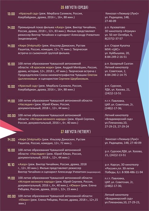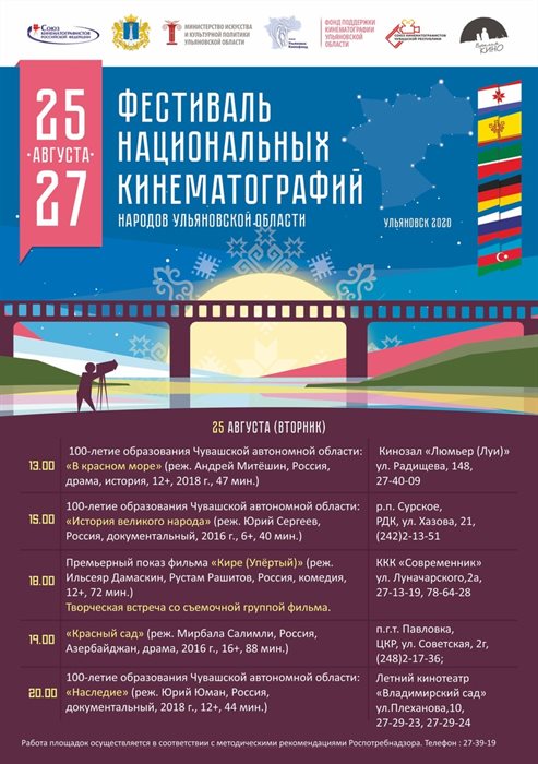 В региональном центре и шести муниципальных образованиях состоятся кинопоказы и творческие встречи с кинематографистами республик Татарстан, Мордовия, Чувашия. Фильмы будут продемонстрированы на национальном языке с субтитрами или с дубляжом. Вход на все кинопоказы бесплатный.