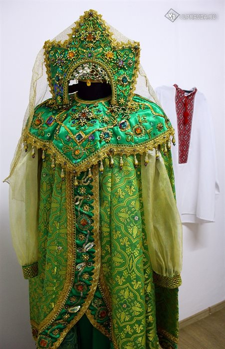 Кроме традиционных костюмов на выставке представлены и работы Елены Уресметовой, выполненные как стилизация. Среди них и самый первый костюм, который она сделала 16 лет назад для родственницы, выступавшей в ансамбле «Симбирочка». И хоть это стилизация традиционного русского костюма, но и его мастерица делала, изучая источники даже из Оружейной палаты.