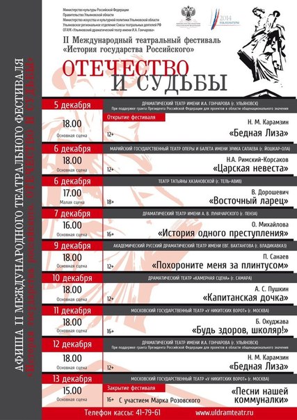 12 декабря историческую программу завершит второй премьерный показ спектакля «Бедная Лиза», а 13 декабря артисты Московского театра «У Никитских ворот» подарят зрителям один из своих лучших спектаклей «Песни нашей коммуналки»: ульяновцы услышат более сорока шлягеров 30-х - 60-х годов в исполнении актеров театра. Особенным подарком для наших зрителей станет выход на сцену заслуженного артиста России Дениса Юченкова, начинавшего свою актерскую карьеру на симбирских подмостках, и самого мэтра — народного артиста России Марка Розовского.