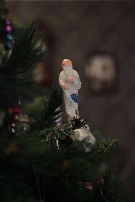 У самой верхушки елки - те самые дореволюционные украшения: бумажные лики ангелов и святых на тонком картоне, расшитые золотинками и мишурой. Им больше ста лет, а они дошли до нашего времени фактически без изъянов.