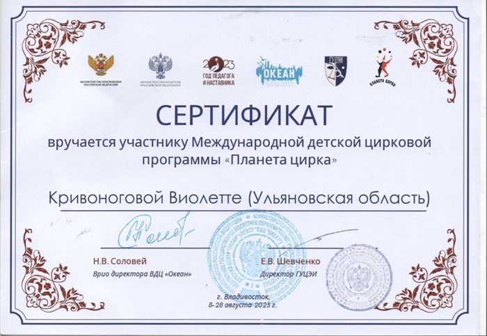 Солистка студии эстрадно-цирковой пластики «Волшебная страна» Дворца творчества детей и молодежи Ульяновска Виолетта Кривоногова за высокие достижения была награждена поездкой на профильную цирковую смену «Планета цирка» с 8 по 28 августа во всероссийский детский центр «Океан» (город Владивосток).