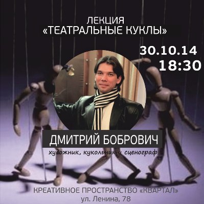 Творческая встреча с главным художником Ульяновского театра кукол имени народной артистки СССР В.М. Леонтьевой Дмитрием Бобровичем состоится 30 октября в 18.30 в Креативном пространстве «Квартал».