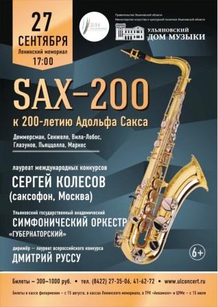 В Ульяновске в Большом зале Ленинского мемориала 27 сентября в 17.00 состоится концерт, посвящённый 200-летию со дня рождения бельгийского изобретателя музыкальных инструментов Адольфа Сакса, который сконструировал саксофон.