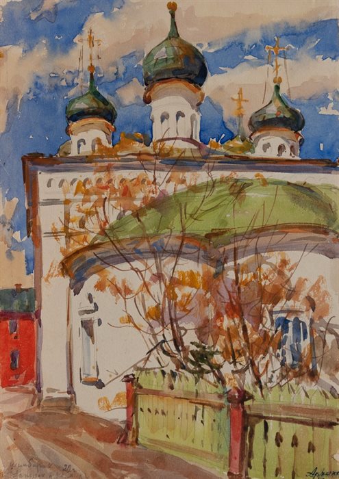 Храм Спаса Нерукотворного Спасского женского монастыря.1922. Бумага, акварель, 22,4х16,1. Из музейного собрания Ленинского мемориала
