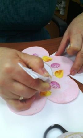 1.Из пенокартона вырезаем заготовку (ромашку и яйцо).2. Яичко декорируем салфеткой (вырезаем детали и клеим). 3.Ромашку тонируем с помощью губки акриловой краской (нежно-розовый). Ждем пока высохнет. 4.Выбираем элементы из салфетки, вырезаем и клеим с помощью синтетической кисточки на ромашку. 5. Начинаем ромашку декорировать: контуры, стразы, блестки, пудра, и т.д. Ждем пока все высохнет. 6. Завершающий этап – покрытие изделия акриловым лаком. 7. Когда оба элемента готовы с помощью нитки яичко вставляем в середину ромашки. За один лепесток прикрепляем атласную ленту к ромашке и вешаем в любое удобное место в доме.