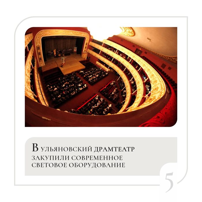 Стоимость софитов нового поколения составила 25 миллионов рублей. В следующем году света станет еще больше, финансирование продолжится, часть средств пойдет на освещение, а другая - на замену кресел в зрительном зале.