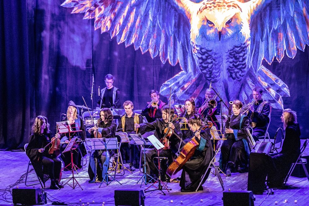 И ведь это не только концерт. Музыканты создают на сцене полный антураж школы Хогвартса: мантии факультетов, свечи, волшебные лампы, колбы с зельем и, конечно же, гигантская сова.