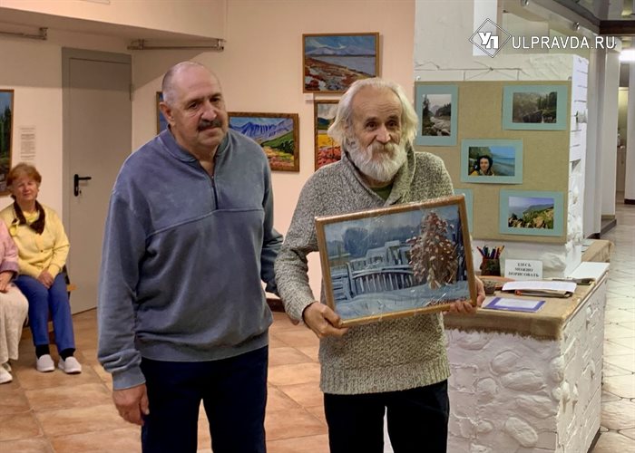 На открытии выставки Алексей Колодин (слева) подарил свою работу первому учителю живописи Александру Зинину