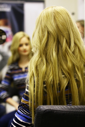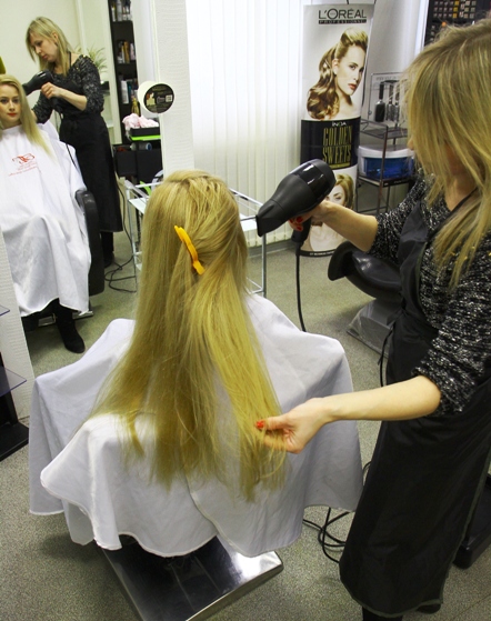 Перед началом мастер нанесла на волосы восстанавливающую маску, на кончики – масло для питания и защиты. Также использовались термозащита по всей длине волос и спрей для создания объема.