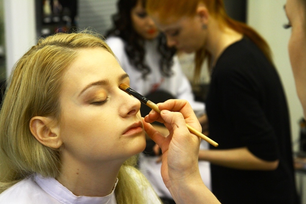 Сначала мастер очистила кожу лица тоником и замаскировала мелкие недостатки с помощью корректора. База под будущий макияж выбрана кремовая – она придает ровный тон и фиксирует мейк-ап.