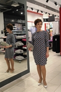 Второй образ состоит из платья свободной формы темно-синего, бордового и белого цветов и дополнен светлым клатчем. Платье само по себе индивидуальное, поэтому не требует дополнительных аксессуаров. Длина у него чуть выше колена, поскольку у Галины стройные ноги и ей не нужно стесняться, чтобы их открывать. Платье достаточно легкое, в нем будет комфортно работать в офисе весной.