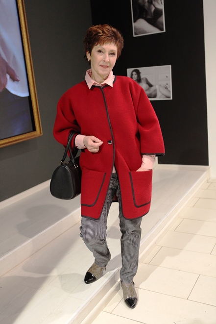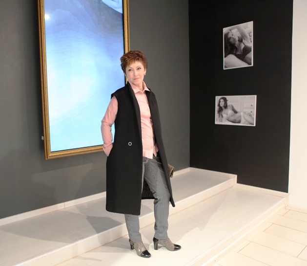 У Галины прекрасная фигура, поэтому одежда для нее подбиралась без труда. В качестве основного образа была составлена тройка из бледно-розовой рубашки, клетчатых брюк и теплого черного кардигана без рукавов. Дополнил имидж клатч прямоугольной формы, подобранный по цвету к ботильонам.