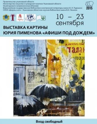10 сентября в 15.00 в Торжественном зале Дворца книги – Ульяновской областной научной библиотеки им. В.И. Ленина состоится открытие проекта Музея русского импрессионизма «Картина в библиотеке». Ульяновцам представят полотно живописца, писателя и книжного иллюстратора Юрия Ивановича Пименова «Афиши под дождем». В этот же день в 16.00 в библиотеке пройдет мастер-класс по коллажированию от школы современного дизайна «Академия «КРЕАПОЛЬЕ».