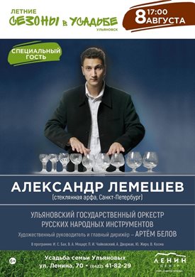 Концерт Александра Лемешева будет организован 8 августа в 17:00 в усадьбе семьи Ульяновых (Ульяновск, улица Ленина, 70).