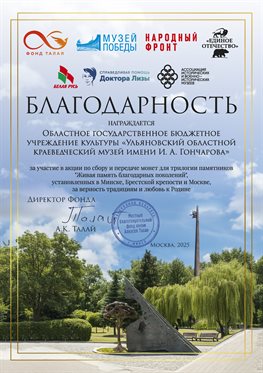 Организаторы Международной акции «Живая память благодарных поколений» выразили благодарность Ульяновскому областному краеведческому музею имени И.А. Гончарова за содействие в организации акции, за верность традициям и любовь к Родине.